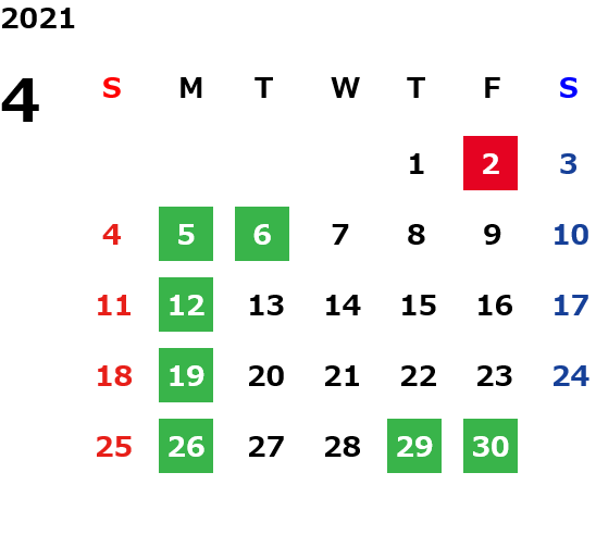月曜定休日を基本としておりますが、不規則でお休みを頂く場合もございます。定休日の詳細は営業日カレンダーをご参照ください。