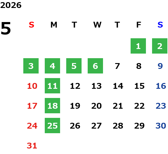 月曜定休日を基本としておりますが、不規則でお休みを頂く場合もございます。定休日の詳細は営業日カレンダーをご参照ください。